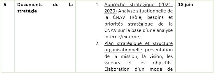 1.Approche stratégique (2021-2023)Analyse situationnelle de la CNAV (Rôle, besoins et priorités stratégique de la CNAV sur la base d’une analyse interne/externe)