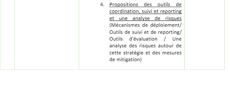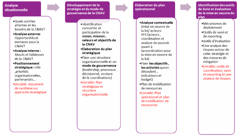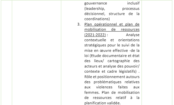 3.Plan opérationnel et plan de mobilisation de ressources(2021-2022): Analyse contextuelle et orientations stratégiques pour le suivi de la mise en œuvre effective -de la loi(Etude documentaire et état des lieux/ cartographie des acteurs et analyse des pouvoir/ contexte et cadre législatifs)Rôle et positionnement autours des problématiques relatives aux violences faites aux femmes. Plan de mobilisation de ressources relatif à la planification validée. 4.Propositions des outils de coordination, suivi et reporting et une analyse de risques(Mécanismes de déploiement/ Outils de suivi et de reporting/ Outils d’évaluation / Une analyse des risques autour de cette stratégie et des mesures de mitigation)