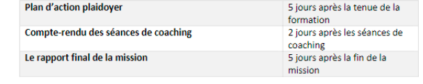 4.Prévoir des séances de coaching auprès des associations pour la mise en œuvre, le suivi et l’évaluation des activités de plaidoyer (1/2 journée par association)