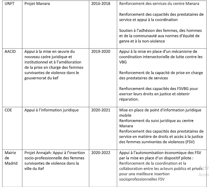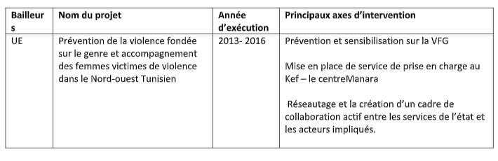 Ce projet s’inscrit dans la suite des projets de collaboration réalisés par l’AFC et la Fondation CIDEAL depuis 2013 en Tunisie. Jusqu’à présent, les deux entités ont co-exécuté 5 projets conjoints qui visent la prévention et l’élimination des VBG et dont les conclusions et les leçons apprises ont été prises en compte pour mettre en œuvre ce présent projet.