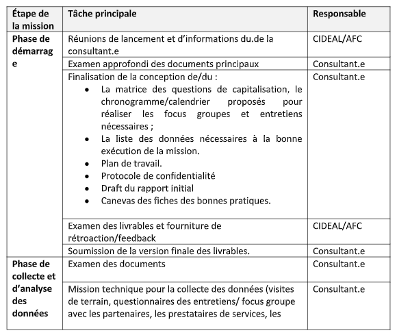 Les partenaires présélectionneront la/le consultant.e sur la base des propositions techniques et financières reçues. Tout au long du processus, la/le consultant.e travaillera en étroite collaboration avec l’équipe de CIDEAL et son partenaire l’Association Femme et citoyenneté. Cette équipe coordonnera le suivi, elle examinera et approuvera les livrables de l’étude.