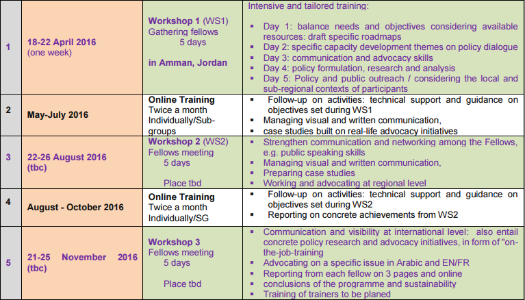 The Fellowship programme invests in the mobilisation of youth as drivers of change and democracy: it aims to involve Youth into policy making and dialogue in the Southern Mediterranean region. It will support the creation of a network of fellows, meeting quarterly during the year, to share experience, monitor progress and provide mutual support.