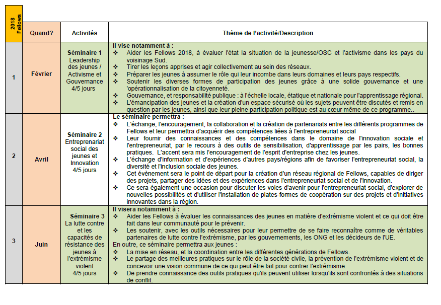 Bien que ce programme s’appuie sur l’expertise et l’expérience accumulées durant la mise en oeuvre des deux premières phases du programme de 2016 et 2017, le programme 2018 faisant l’objet de cet appel, permettra aux « Fellows 2018 » de travailler sur un agenda d’Action Jeunesse, d’identifier les priorités et les actions pour les jeunes et leur réseau ainsi que pour la société civile dans la région. Le programme est susceptible de déboucher sur des solutions réalisables et des recommandations liées aux préoccupations nationales et régionales au sein de l’IEVP, notamment celles liés à la résilience, la migration, l’employabilité et l’extrémisme violent.
