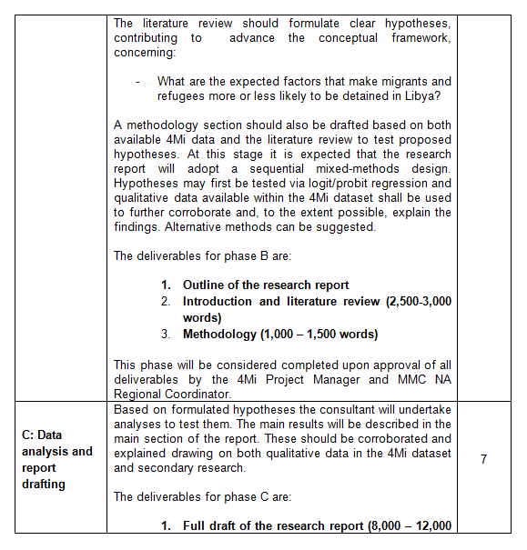 Under the direct supervision of the 4Mi Project Manager, the purpose of the consultancy is to produce a research report exploring what makes people on the move more likely to end up in detention in Libya and, in so doing, to advance an analytical framework on the drivers of detention.