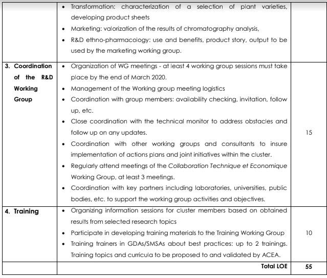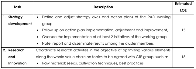 Within the framework of initiating and assisting the development of the “WIKI PAM” Cluster of natural extracts in northwest Tunisia, the R&D Specialist will be overseeing the activities of the R&D Working Group. The latter is a sub-group composed of 10 to 20 cluster members (including representatives of laboratories, associations of artisans, universities, regional and national public sector agencies, etc.) working together to identify and solve research and development problems linked to the medicinal and aromatic plants value chain in northwest Tunisia. The R&D specialist will be responsible of the overall assistance and guidance of the group to achieve its goals and implement established action plans.