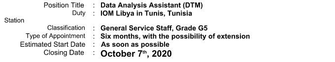 Under the overall supervision of the Deputy Chief of Mission and direct supervision of the Programme Coordinator of Displacement Tracking Matrix (DTM), the Data Analysis Assistant will be responsible for the responsibilities listed below.