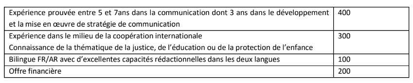 Un comité d’évaluation du DCAF et du Bureau du Délégué Général à la protection de l’enfance sera chargé d’évaluer les offres recevables. La sélection sera basée sur l’offre technique et financière, notée sur une base de 1000 points, répartis comme suit. Toute offre ayant une note inférieure à 700/1000 sera immédiatement éliminée.