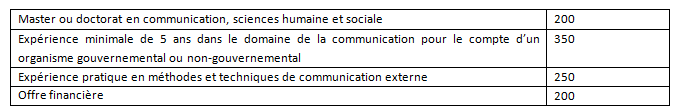 La sélection sera basée sur la capacité technique, notée sur une base de 1000 points, répartis comme suit. Toute offre technique ayant une note inférieure à 700/1000 sera immédiatement éliminée.