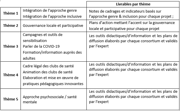 - Livrable 4 : Une liste des supports pédagogiques élaborés et/ou validés par les organismes institutionnels, notamment le ministère de l’Education et le ministère de la Santé