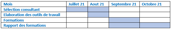 - Quatre (04) jours pour l’exécution de la formation (2 jours par atelier dans 2 régions) ;
