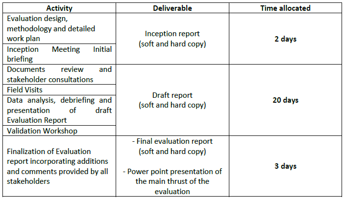 The evaluation is expected to start by end of May 2018/early June for an estimated duration of 25 working days. This will include desk reviews, field work – interviews, and report writing as follow: