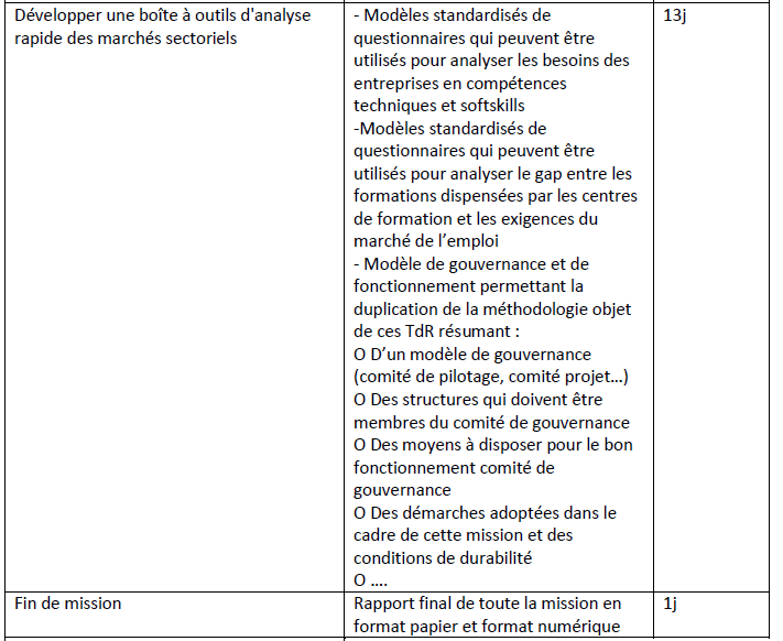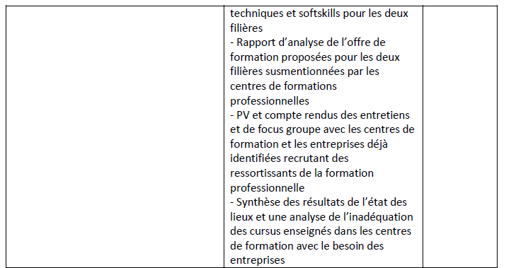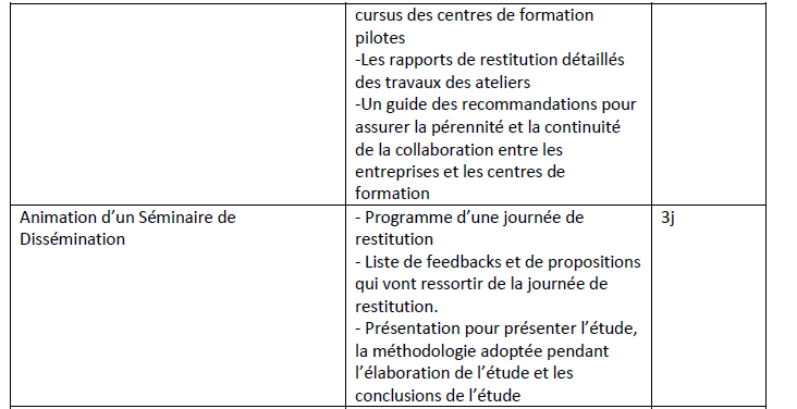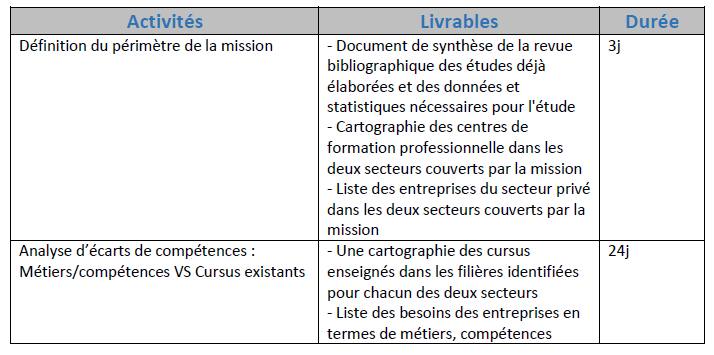 - Etude sectorielle d’analyse d’écarts entre l’offre de formation professionnelle proposée par les centres de formation professionnels concernés et les besoins des entreprises privées et du marché de l’emploi sur la base de référentiel métiers compétences.