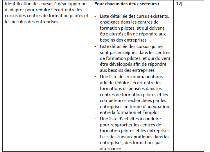 - Identification des cursus qui ne sont pas enseignés dans les centres de formation pilotes, et qui doivent être développés afin de répondre aux besoins des entreprises