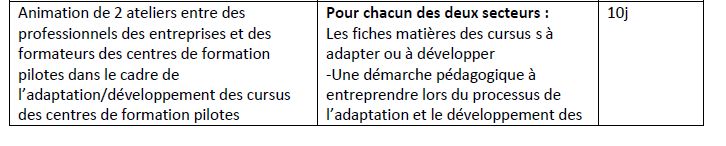 4) Animation de 2 ateliers entre des professionnels des entreprises et des formateurs des centres de formation pilotes dans le cadre de l’adaptation/développement des cursus des centres de formation pilotes