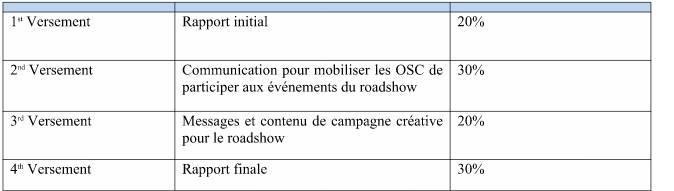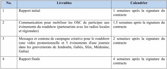 Les objectifs de la mission comprennent la livraison de: (1) une stratégie et des directives de promotion des tournées de présentation conformes à l’objectif et aux résultats du projet; (2) élaboration de matériel promotionnel; (3) des partenariats avec des stations du radios locales pour mieux diffuser les informations sur le roadshow et assurer un haut niveau de participation lors des événements; (4) mobilisation des dirigeants de la société civile et des institutions publiques pour identifier et encourager la participation des OSC fortes, avec un effort particulier pour atteindre les OSC dirigées par des femmes et celles situées dans des régions éloignées ou vulnérables.