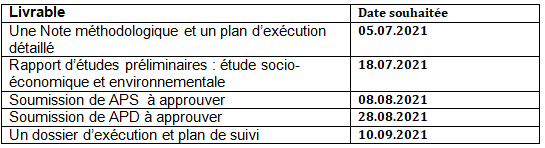 La période entière consacrée à l’exécution de l’étude y inclut les périodes d’approbation de chaque étapes s’étale du 05.07.2021 jusqu’au plus tard le 15.09.2021.
