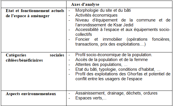 Il s’agit d’une étude socio-économique en vue d’établir un descriptif de la situation actuelle, et décrire ainsi le tissu urbain et socio-économique l’état de l’espace, niveau socioéconomique de la population des quartiers concernés et des exploitants. Il est demandé de réaliser une étude socio-économique, qui suppose la détermination du fonctionnement actuel de l’espace, des caractéristiques économiques et sociodémographiques de la population des concernés par l’aménagement de l’espace, de la situation des exploitations et leur exploitants ainsi de la situation foncière.