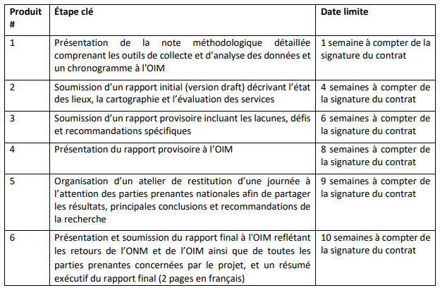 • Discuter avec l’OIM de la démarche à suivre pour la réalisation de l’état des lieux et élaborer une note méthodologique, à valider par l’OIM ;