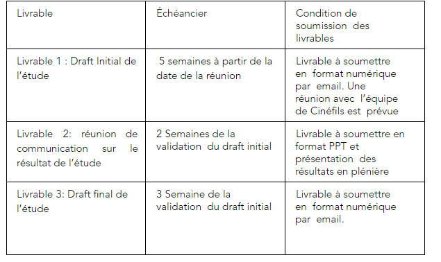 Dès la réunion de démarrage, les consultants-experts fixeront, en concertation avec l’équipe de Cinéfils, un calendrier de travail précisant les dates des différents livrables. Il s’agit de: