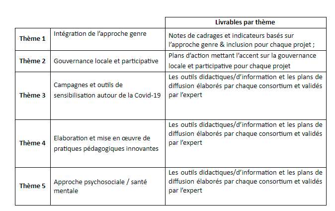 - Un appel à propositions pour la sélection et le financement de projets en cascade contribuant à la réduction de la transmission communautaire de la COVID-19 et l’accès à la santé en milieu scolaire.
