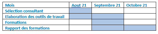 - Quatre (04) jours pour l’exécution de la formation (2 jours par atelier dans 2 régions) ;