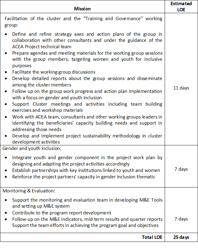 The local consultant will work on the facilitation of the afore mentioned working group, as well as assisting the project’s technical team in the design program activities and their adaptation taking into consideration the youth and gender inclusion aspect. The consultant will also be expected to work on establishing strong partnerships with the relevant institutions to build up the youth and gender inclusion component of the project.