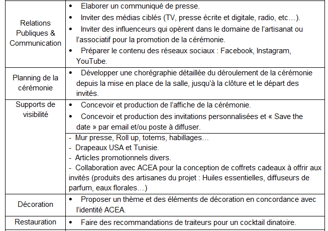 est planifiée en date du 29 Juin 2019. Lors de cette cérémonie, le projet ACEA compte inviter plusieurs partenaires, bénéficiaires du projet et autres collaborateurs pour :