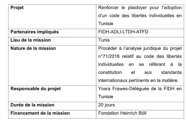 du dialogue entre les acteurs associatifs et politiques, la communication et le plaidoyer, ce projet soutenu par la Fondation Heinrich Böll et étalé sur l’année 2019 débutera par la mise en place d’un pôle d’expert-e-s qui réaliseront une étude juridique permettant d’analyser le projet de code des libertés individuelles (Projet Numero 71/2018 1 ) à la lumière de la constitution tunisienne et des standards internationaux pertinents en matière d’égalité et des libertés individuelles.