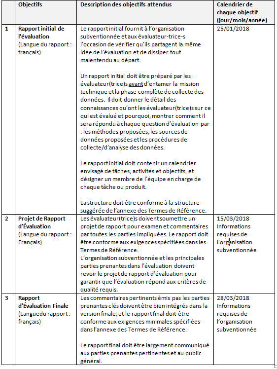Les partenaires font appel à un-e consultant-e ayant une expérience confirmée dans le domaine de l’évaluation sensible au genre. La méthodologie de l’évaluation sera conçue en cohérence avec l’approche de gestion axée sur les résultats.La méthodologie s’articulera autour des critères et des questions couvrant ces critères tels que formulés dans la partie intitulée « question de l’évaluation ». L’évaluateur doit, remplir et soumettre ce tableau révisé et complété au besoin dans le cadre d’un rapport initial d’évaluation et le joindre au rapport final en annexe.