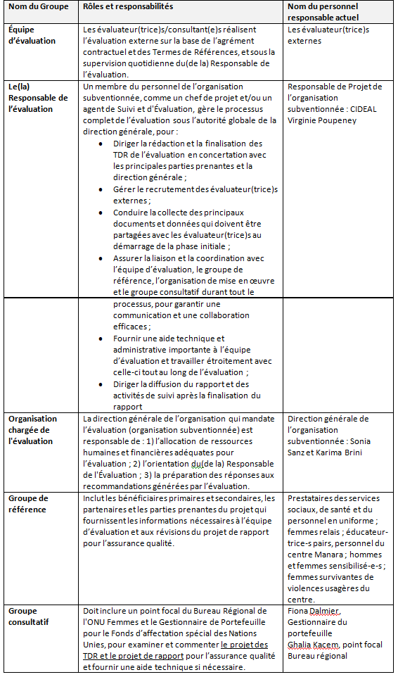 Cette évaluation est finale et obligatoire, requise par le Fonds d’affectation spéciale des Nations Unies pour l’Élimination de la Violence à l’égard des Femmes. Elle couvrira la période de mise en œuvre du projet. L’impact du projet sera évalué au cours du dernier trimestre par un-e évaluateur-trice externe en fonction du niveau de réalisation de chacun des principaux résultats principaux.