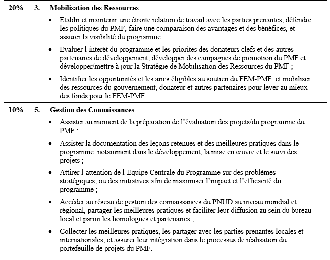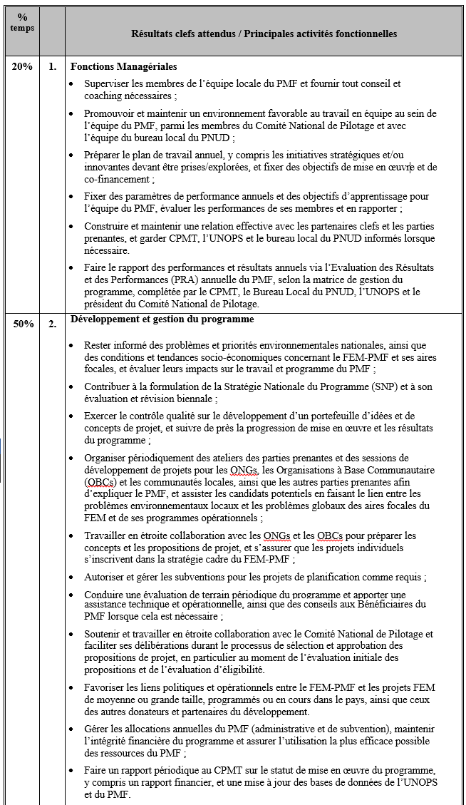 Gestion efficace de l’équipe locale du FEM-PMF (Fonds pour l’Environnement Mondial – Programme de Micro-Financement), du programme PMF et de son portefeuille – depuis la stratégie programmatique jusqu’à la conception et rédaction des projets individuels, en passant pour le soutien technique aux bénéficiaires du programme – afin d’assurer la bonne conformité du programme avec le Cadre Stratégique du PMF approuvé au niveau global, le Guide Opérationnel du PMF, le programme annuel de travail du PMF, les priorités environnementales nationales, ainsi que la mise en œuvre annuelle des objectifs du programme à l’échelle nationale.