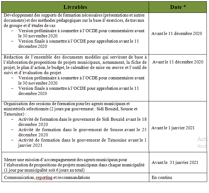 - Rédiger l’ensemble des documents modèles qui serviront de base à l’élaboration de propositions de projets municipaux. La liste exhaustive et détaillée des documents ainsi que le contenu de ces derniers seront définis en collaboration étroite avec le MoLA et l’OCDE. A minima, il s’agira de développer un modèle de fiche de projet, plan d’action, budget, calendrier de mise en œuvre et outil de suivi et d’évaluation du projet.