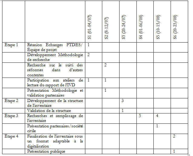 Le travail demandé est estimé à 21 jours ouvrables à partir du mois de juin 2019 et jusqu’au mois d’août réparti selon le chronogramme indicatif ci-dessous. Le chronogramme sera revu dès le début de la recherche pour l’adapter aux exigences et évènements pertinents du projet en cours.