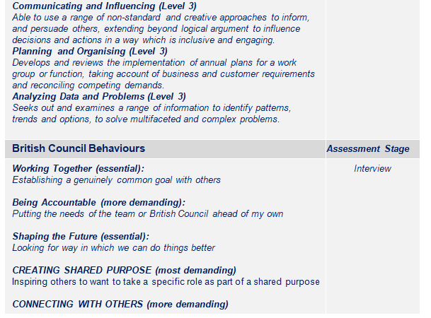 The role will support the achievement of British Council corporate standards and the achievement of relevant policies and procedures.