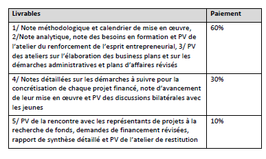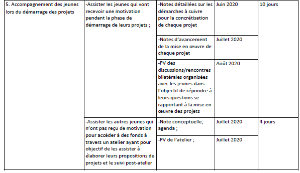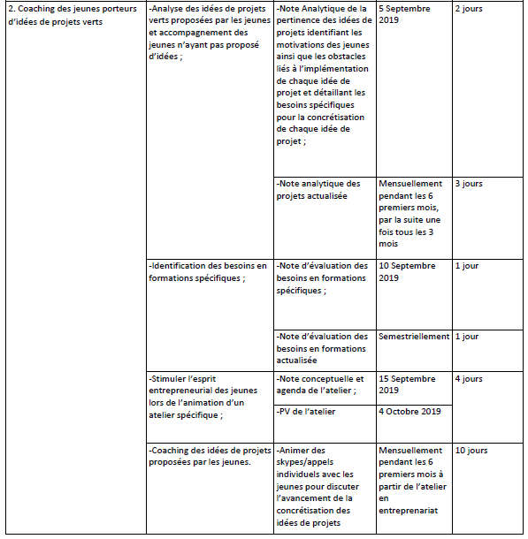 Le prestataire de service devra assurer le coaching des jeunes. Il devra également identifier les motivations des jeunes ainsi que les atouts et les obstacles liés à l’implémentation de chaque projet et de définir les besoins en formations spécifiques permettant d’aboutir aux « Business plans».
