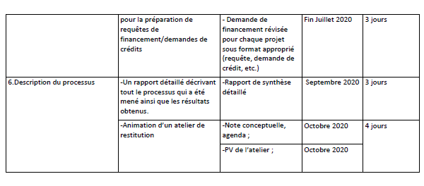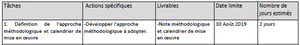 Les tâches, les livrables, le calendrier ainsi que les jours estimés nécessaires à l’achèvement de la mission sont inclus dans le tableau ci-dessous :