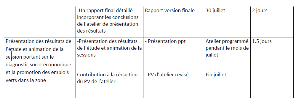La prestation globale est de l’ordre de 12 H/J (comme détaillé dans le tableau ci-dessus) et s’étale sur une période d’un mois à compter de la date de signature du contrat entre les parties. La prestation sera menée au niveau de la délégation de Ghar El Melh en Tunisie.
