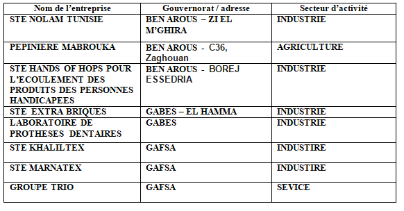 Au même temps, le projet a permis de sensibiliser les entreprises dans les 3 gouvernorats sur l’emploi et des personnes handicapées. Il présente à ce niveau des expériences innovantes qui ciblent l’implication des entreprises de différentes tailles dans les 3 gouvernorats ainsi que des personnes handicapéesinscrites dans les bureaux de l’emploi, dans des centres de formation spécialisés et dans les unités locales de promotion sociales dans des dynamiques locales de coordinations entre acteurs.