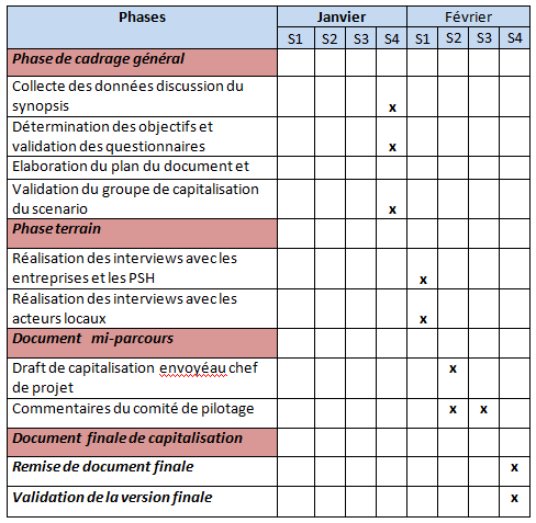 Le processus de cette capitalisation prendra en considération les entreprises qui ont recruté des PSHpendant la période de mise en œuvre du projet à travers des interviews de différentes personnes ressources ayant contribué activement au processus d’insertion:des DRH,des tuteurs d’entreprises, les personnes handicapées concernées, et des personnelsstructures d’accompagnement à l’emploi publiques et associatives. Cette diversité permettra d’avoir différents points de vue sur les bonnes pratiques capitalisées tout en considérant le fait que les processus capitalisés se focaliserons sur des bonnes pratiques au sein de l’entreprise.