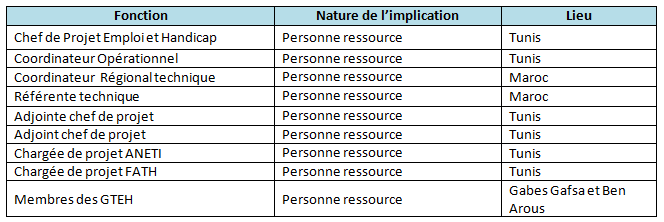 500 demandeurs d’emploi en situation de handicap ; 60 prestataires de services d’insertion professionnelle ; 100 professionnels des services d’insertion professionnelle (60 conseillers d’emploi de l’ANETI, 27 professionnels des associations spécialisées dans le domaine du handicap et 13 formateurs de l’ATFP); 100 entreprises publiques, privés et spécialisés ; Les partenaires sociaux (syndicats de salariés, organisations patronales); Les autorités publiques locales et nationales (les cadres des Ministères des Affaires Sociales et de la Formation professionnelle et de l’Emploi).