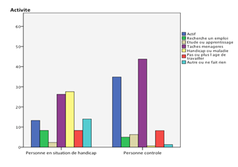 Les personnes handicapées, considérées comme le groupe le plus vulnérable, présentent une moyenne des taux de chômage trois à quatre fois plus élevé que le reste de la population active, comme cela a été démontré par plusieurs études internationales récentes (OMS, 2010; OCDE, 2010). De plus le niveau d’activité des personnes handicapées en âge de travailler (de 15 à 65 ans) est particulièrement faible (OTDDPH, 2014), environs 13,3% ont une activité régulière contre 34,8% des personnes contrôles (Figure 1).