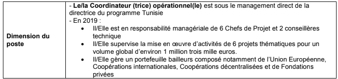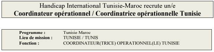 Mission générale : Le/la Coordinateur (trice) opérationnel(le) Tunisie pilote la conduite opérationnelle des projets de Handicap International en Tunisie et l’appui aux chefs de projet. Il/elle est responsable de la