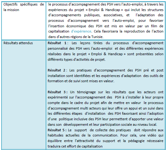 Type de mission : Réalisation d’un film de capitalisation d’expériences et des pratiques entrepreneuriales pour l’emploi des personnes handicapées. /Réalisation de 2 spots de sensibilisation sur l’importance/la nécessité de la mise en application du quota de l’emploi des PH en Tunisie