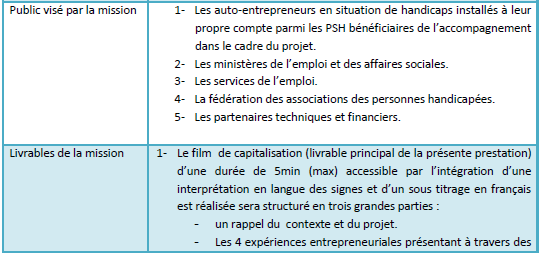 La mission de capitalisation concerne principalement l’accompagnement vers l’auto-emploi des personnes handicapées. Elle permettra de valoriser les pratiques menées par les acteurs (spécifiques et ordinaires) dans un processus d’accompagnement adapté des personnes handicapées vers l’installation à leur propre compte. En sommes, elle permettra le « passage de l’expérience à une connaissance partageable »