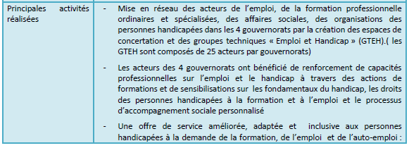Il présente à ce niveau des expériences innovantes d’adaptation d’outils d’accompagnement et qui cible les différents acteurs de l’accompagnement dans les 4 gouvernorats ainsi que des personnes handicapées dans des centres de formation spécialisé , dans les unités locales de promotion sociales, dans les bureaux de l’emploi et du travail indépendant et dans les espaces entreprendre.