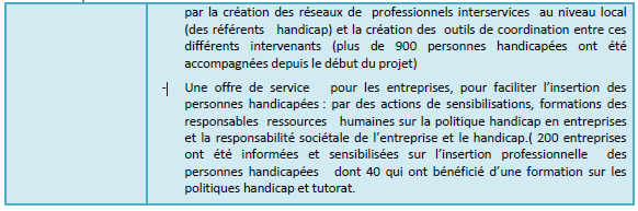 le projet « emploi & Handicap » a permis de travailler sur une meilleure coordination entre les différents acteurs de l’accompagnement et de l’insertion et leur mise en réseau, pour améliorer l’employabilité des PSH et faciliter leur accès à l’emploi et / ou l’auto-emploi. En parallèle, le projet a mis en place un accompagnement personnalisé et adapté pour les autoentrepreneurs handicapés qui favorise leur autonomisation, facilite le montage de leur projet (microentreprise) ainsi que l’installation à leur propre compte.