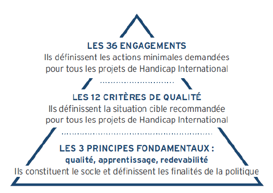 L’évaluation finale du projet s’inscrira dans le cadre de la politique de Planification, Suivi et Evaluation (PSE)1 d’Humanité & Inclusion (2015). La politique est constituée de trois principes fondamentaux, 12 critères et 36 engagements minimaux d’action qui ont été fixés dans un ensemble cohérent visant à répondre aux principaux enjeux internes et externes de l’organisation : Voir lien