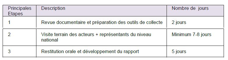 L’évaluation devra démarrer au plus tard le 15 Octobre 2018 avec une remise du rapport final au plus tard le 5 novembre 2018.