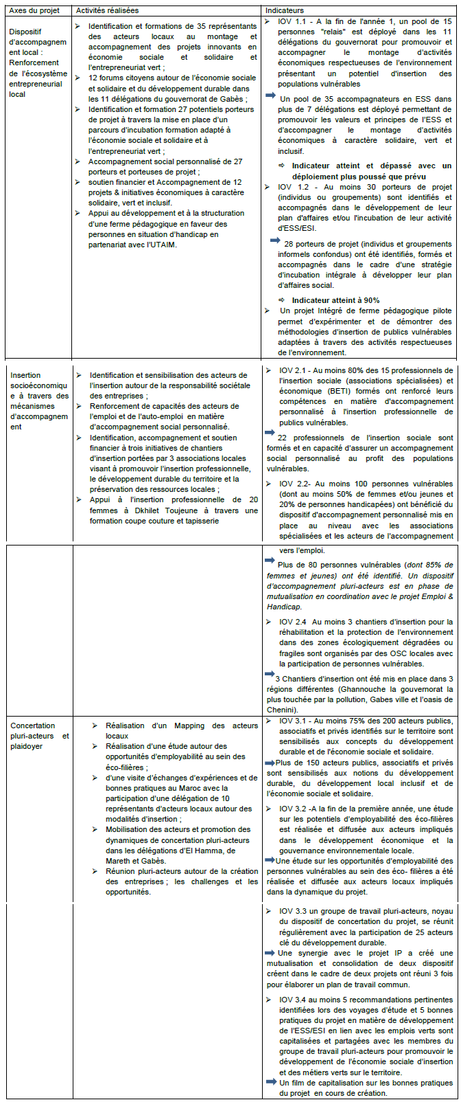 Les acteurs de la société civile sont mobilisés autour de dynamiques partenariales pluri-acteurs et renforcés dans leurs capacités à mettre en oeuvre des initiatives économiques locales innovantes, endogènes et écologiquement responsables permettant l’insertion socioéconomique des populations vulnérables-en particulier les femmes, les jeunes et les personnes handicapées-dans le gouvernorat de Gabès.