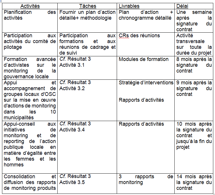 Appuyer le travail de monitoring des OSC et le développement de la culture de la redevabilité autour des actions menées par les AL en faveur de l’égalité entre les femmes et les hommes au niveau des 7 municipalités ciblées par le projet.